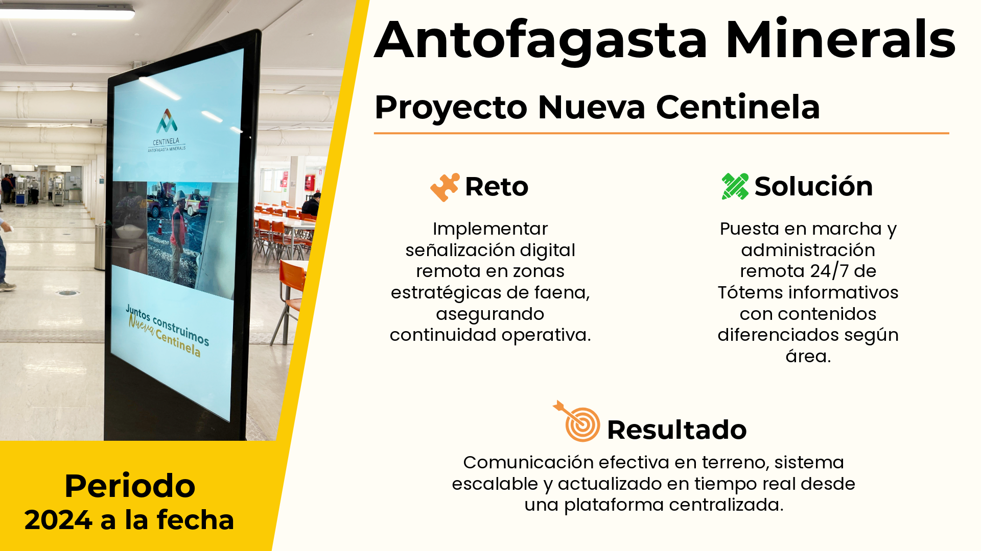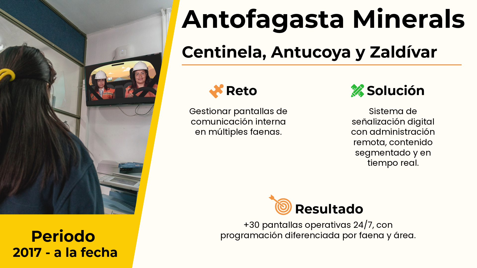 Más de 50 pantallas activas en faenas mineras. Sistemas administrables en línea, sostenibles y dinámicos.