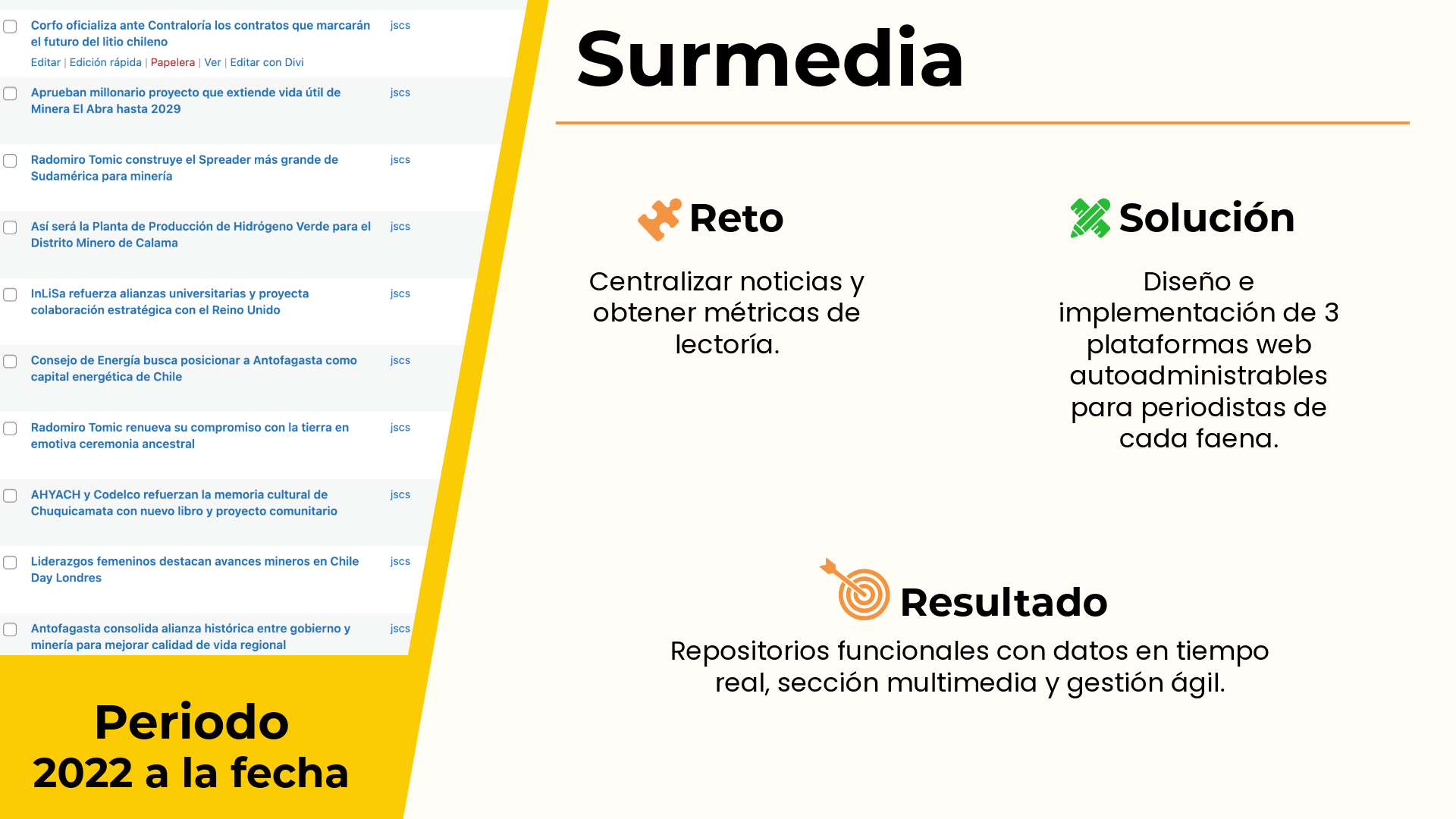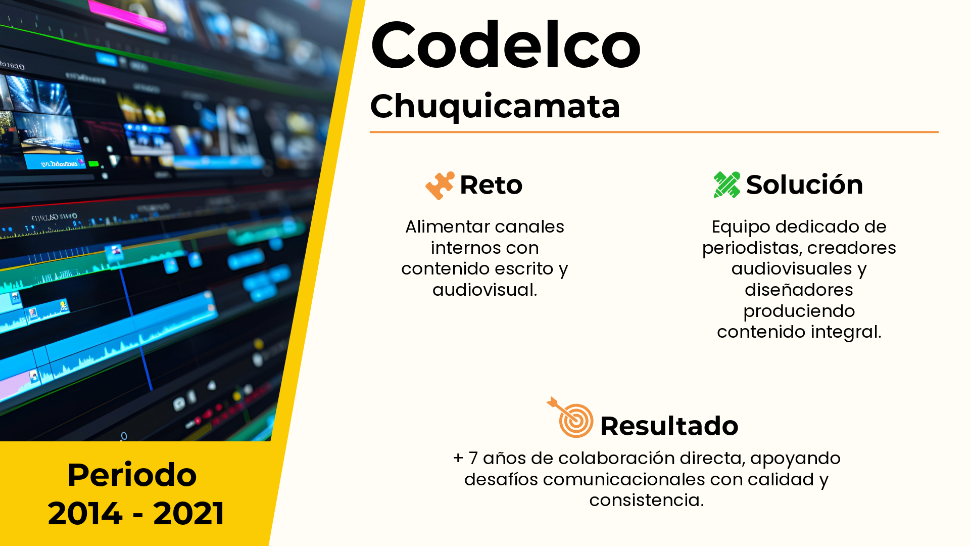 Somos un equipo de periodistas, realizadores y diseñadores que crea estrategias, contenidos y experiencias multimedia. Desde Calama, acompañamos a organizaciones del norte de Chile en sus procesos de transformación comunicacional.
